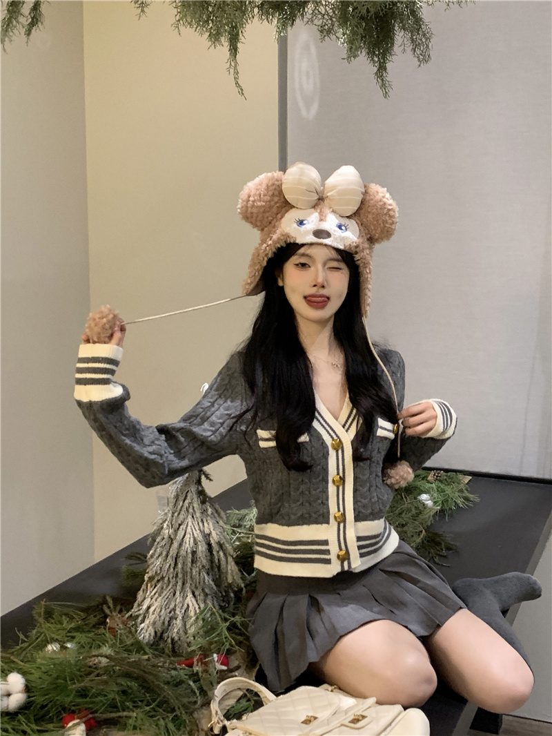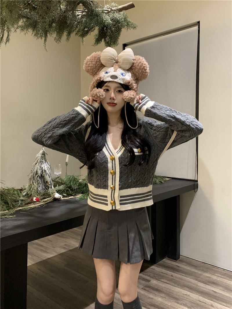 韩版灰色小香风麻花针织开衫女v领毛衣新款外套短款长袖上衣秋季